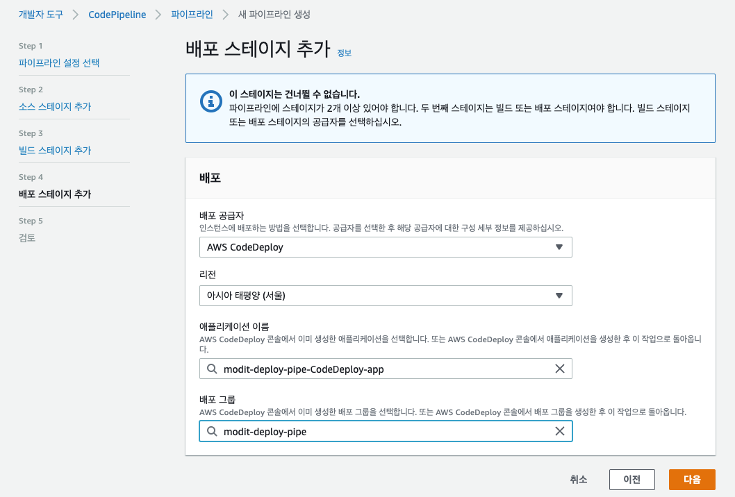 ์ฌ์ค์ codebuild ๊น์ง ์ฌ์ฉํด์ ๋น๋ ํ์ผ์ ๋ง๋๋ ์์ ๋ ํด์ผํ์ง๋ง ์ ์ฒ์์ด๋๊น ์ผ๋จ CodeDeploy์ CodePipeline ๋ง ์ ์ฉํ์ฌ ๋ฐฐํฌํด๋ณด๊ฒ ์ต๋๋ค.