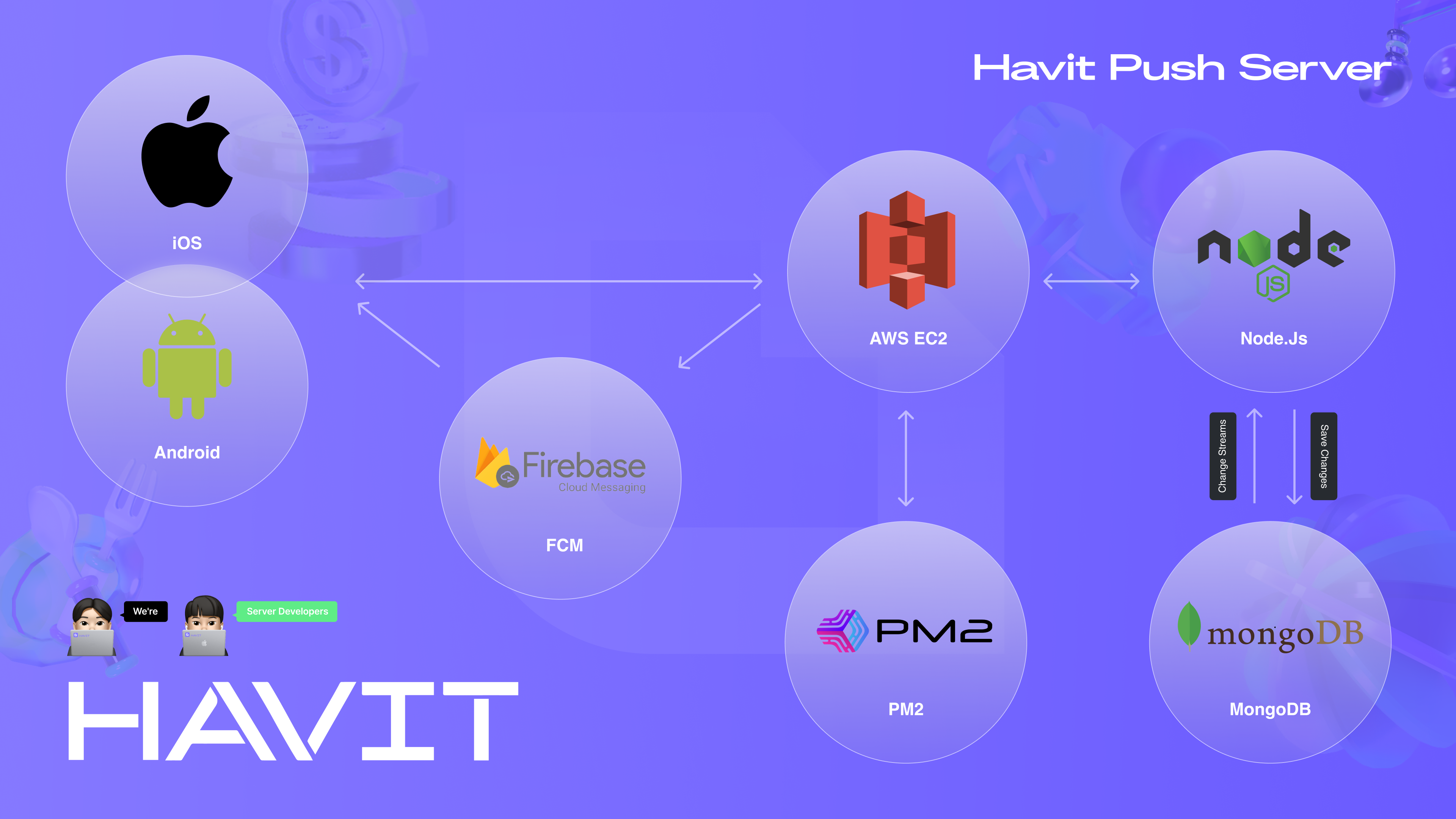 Push-Server 는 Node.js, Express, MongoDB, TypeScript 로 구성하였고, 배포 환경은 AWS EC2 (Ubuntu 18.04 LTS), PM2를 사용했습니다.