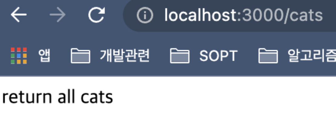 이 메서드에서는 응답 상태 코드로 200을 반환한다. 이 경우에는 문자열('return all cats')일 뿐이다.