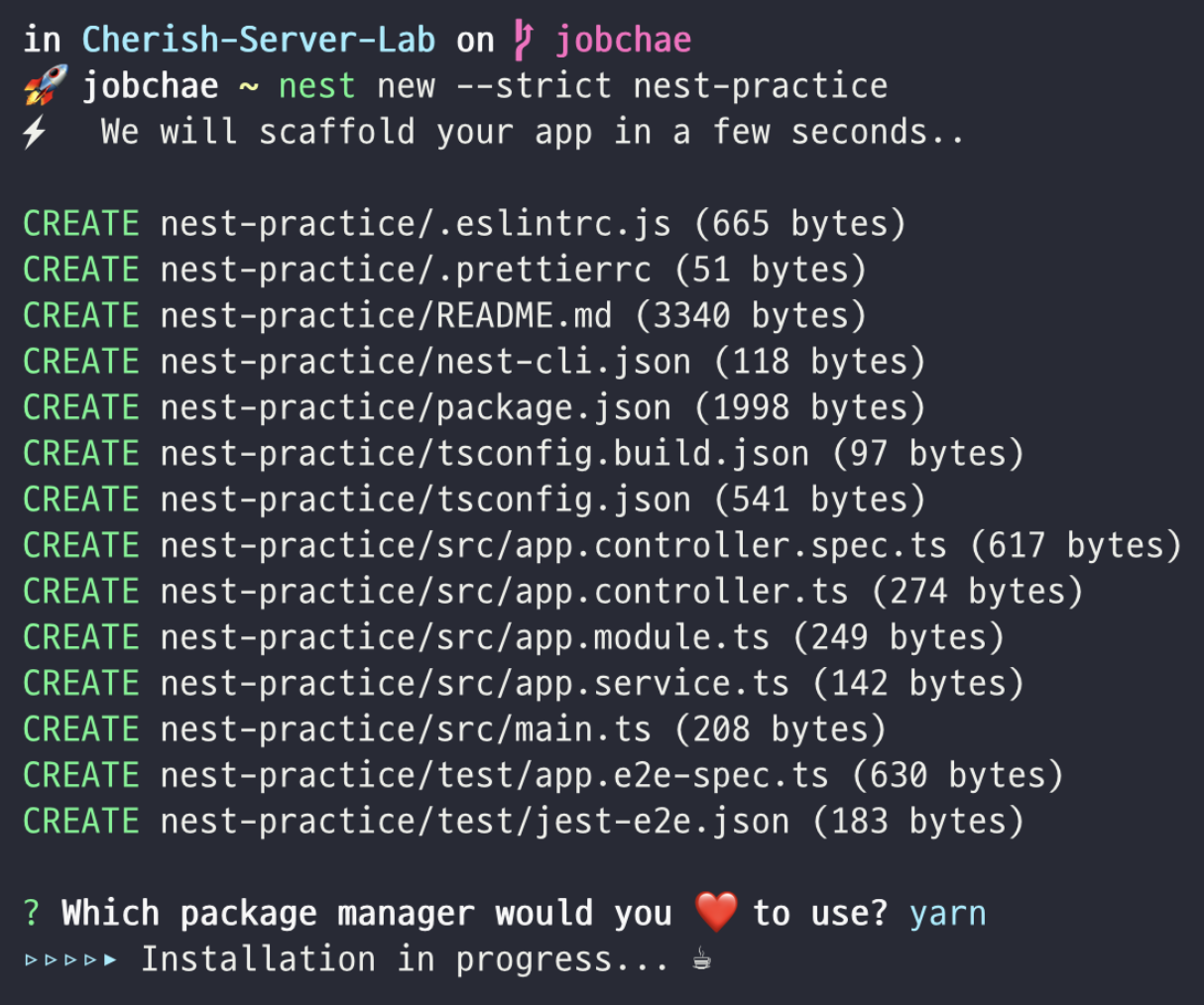 스타터 프로젝트롤 clone 하여 시작할 수도 있지만, 처음 사용자는 Nest CLI 를 통해 만드는 것을 추천한다.