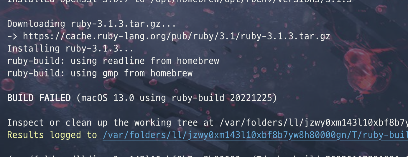 Help me.... plz help me... i tried install ruby 100times for create git blog by local. but ❯ rbenv install 2.7.7 To follow progress, use 'tail -f /var/folders/_q/0v9yhl5j1wz64t17fwvzljsw0000gn/...