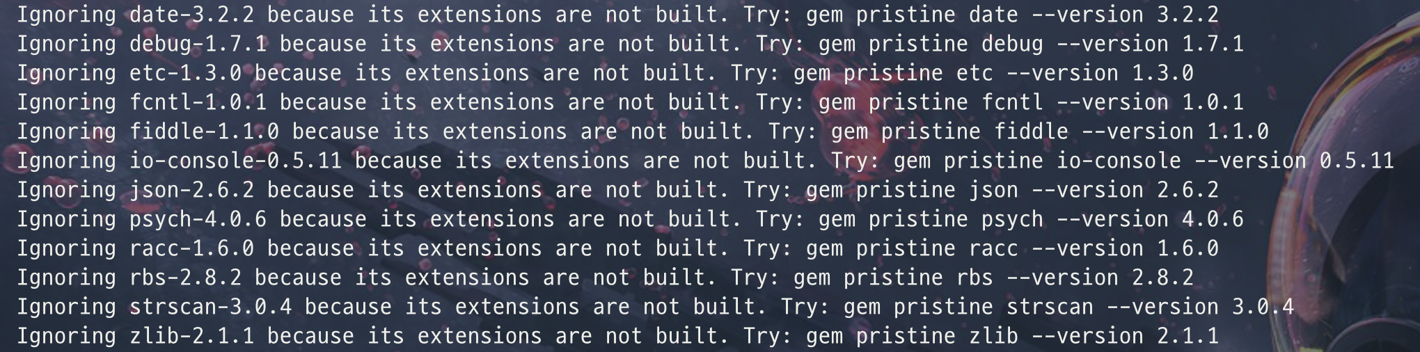하지만 gem pristine 을 하려니까 두번째처럼 reinstall ruby 메시지를 뱉었다.