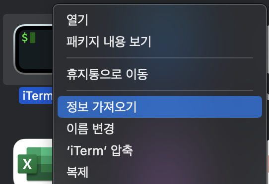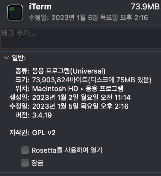 맥북 파인더에서 [응용 프로그램] -> [iTerm] 우클릭 -> [정보 가져오기] -> [Rosetta를 사용하여 열기] 체크 해제