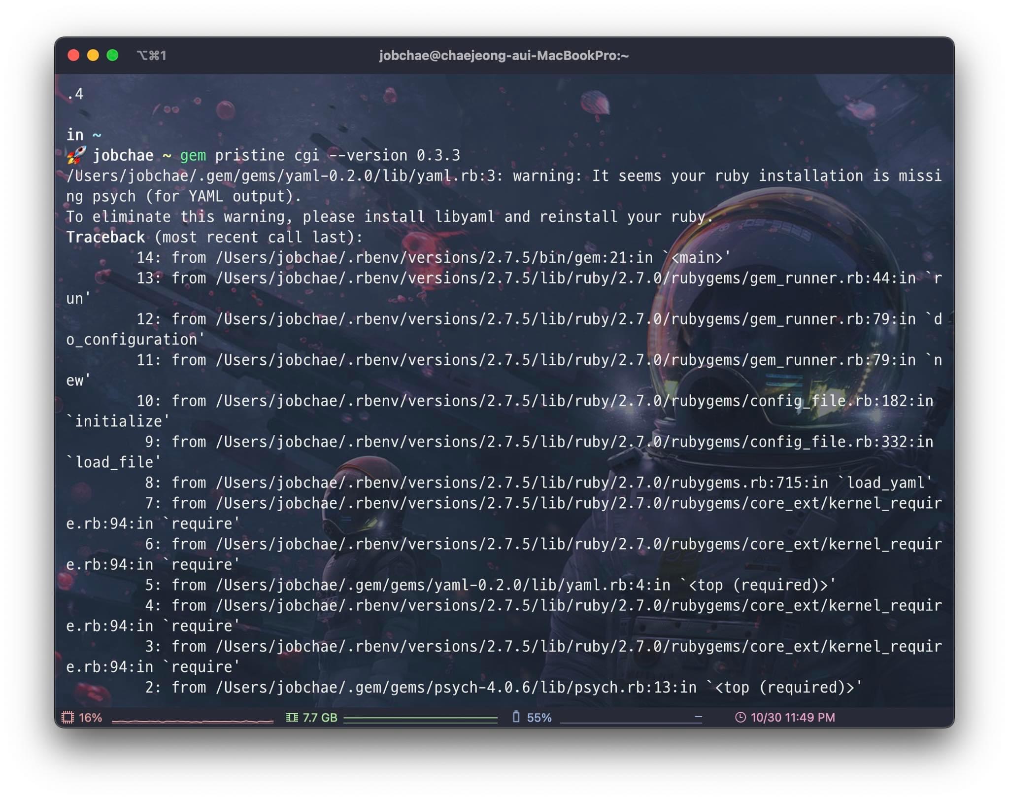 저렇게 gem pristine 을 하라는 글이 수도없이 떴다. 대충 ruby가 뭔가 꼬였구나 직감했다.
