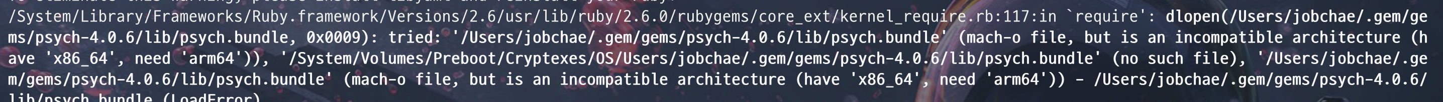나는 m1 맥북이 처음 나왔던 시절 쯤 구매를 해서 그때 상태 그대로 로제타로 터미널을 열고, intel 에 맞는 homebrew 를 쓰고 있기에, ruby, gem 도 x_86_64 에 맞춰져 있는게 원인인 듯 싶었다.