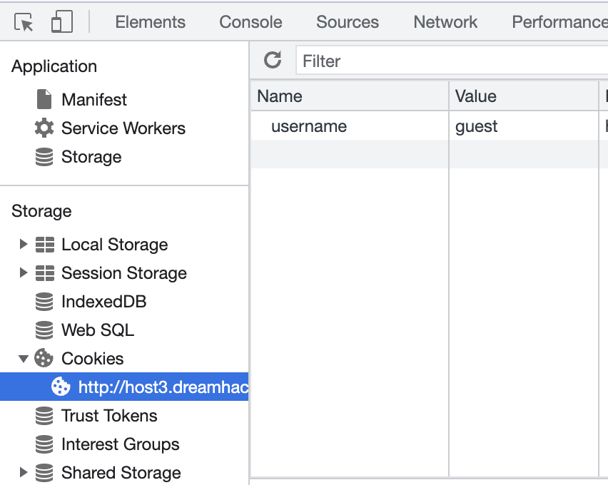 개발자 도구 Cookies 에서 username, guest 쿠키를 확인할 수 있다.