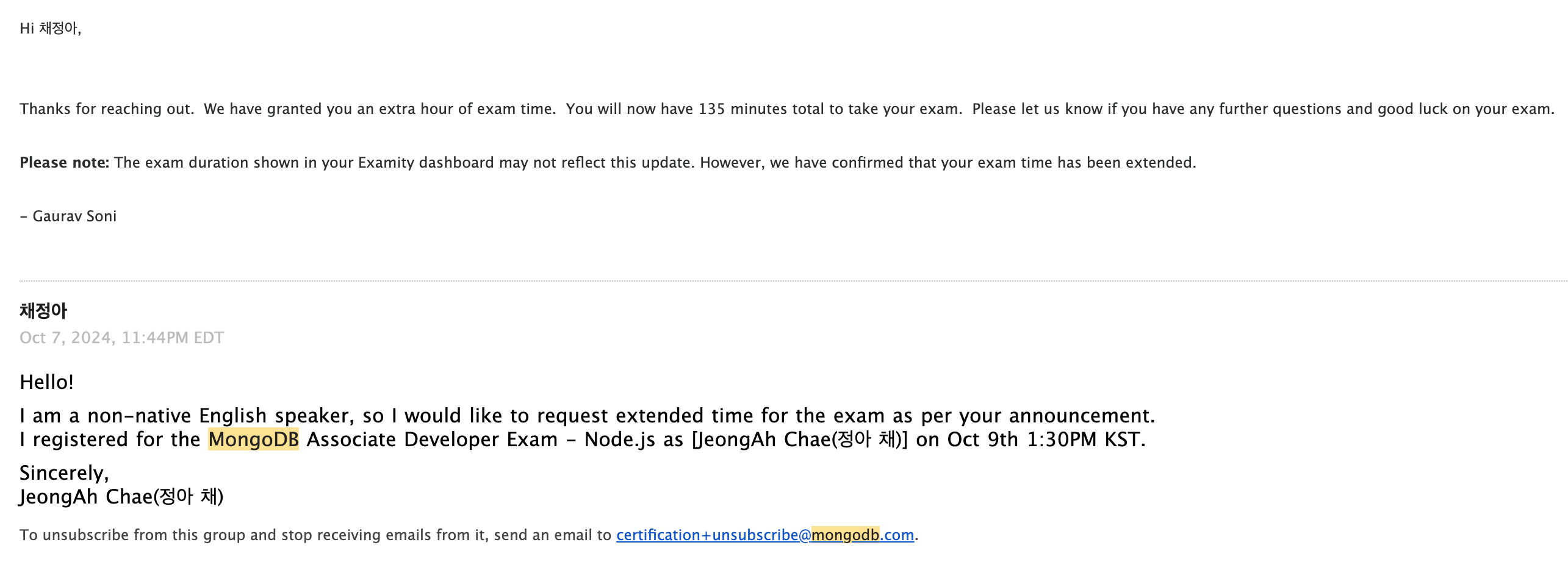 시험 전에 certification@mongodb.com 메일로 non-native English speaker임을 어필하시면 시험시간이 135분이 되는 기적을 보여줍니다.