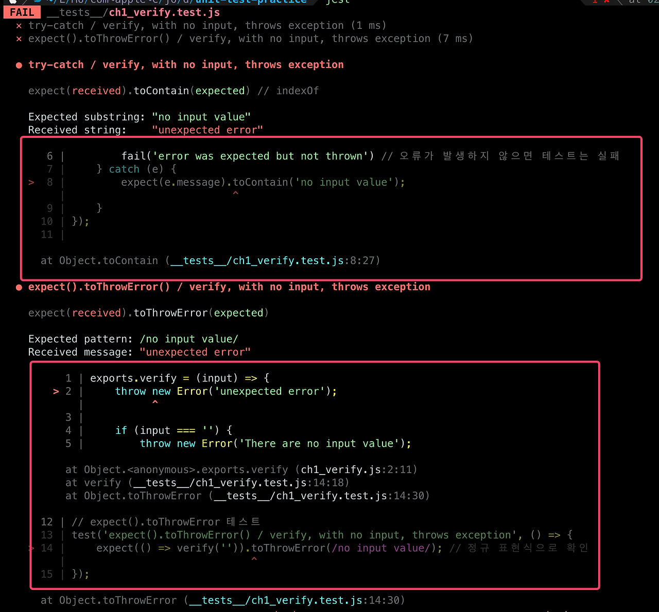 직접 확인해보니 책에 언급된 케이스 이외에 2번째 경우 때문에도 expect().toThrowError() 방식으로 검증해야겠다는 생각이 들었다.