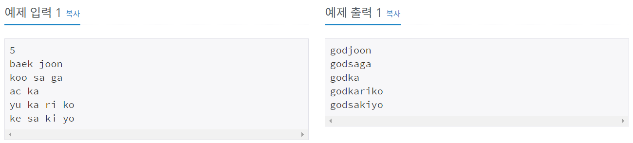 첫 번째 줄에는 닉네임의 수 N(1 ≤ N ≤ 100)이 주어진다. 두 번째 줄부터 N개의 줄에는 음절 단위로 쪼갠 닉네임이 주어진다. 각 줄은 알파벳 소문자와 공백만으로 이루어지며, 쪼갠 닉네임의 총 길이(공백 포함)는 100을 넘지 않는다. 쪼갠 닉네임에는 1개 이상의 공백이 존재한다.