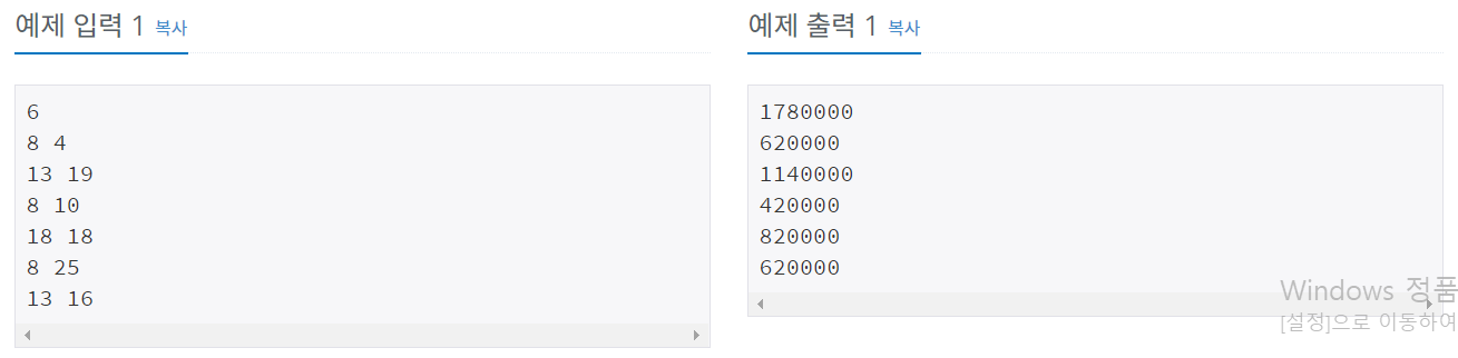 각 가정이 성립할 때 제이지가 받을 상금을 원 단위의 정수로 한 줄에 하나씩 출력한다. 입력이 들어오는 순서대로 출력해야 한다.