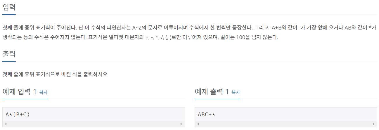 첫째 줄에 중위 표기식이 주어진다. 단 이 수식의 피연산자는 A~Z의 문자로 이루어지며 수식에서 한 번씩만 등장한다. 그리고 -A+B와 같이 -가 가장 앞에 오거나 AB와 같이 *가 생략되는 등의 수식은 주어지지 않는다. 표기식은 알파벳 대문자와 +, -, *, /, (, )로만 이루어져 있으며, 길이는 100을 넘지 않는다.