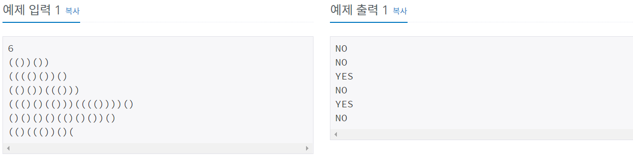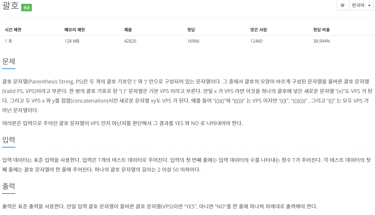 문제 괄호 문자열(Parenthesis String, PS)은 두 개의 괄호 기호인 ‘(’ 와 ‘)’ 만으로 구성되어 있는 문자열이다. 그 중에서 괄호의 모양이 바르게 구성된 문자열을 올바른 괄호 문자열(Valid PS, VPS)이라고 부른다. 한 쌍의 괄호 기호로 된 “( )” 문자열은 기본 VPS 이라고 부른다. 만일 x 가 VPS 라면 이것을 하나의 괄호에 넣은 새로운 문자열 “(x)”도 VPS 가 된다. 그리고 두 VPS x 와 y를 접합(conc