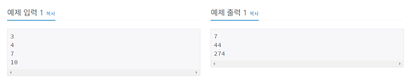 문제 정수 4를 1, 2, 3의 합으로 나타내는 방법은 총 7가지가 있다. 합을 나타낼 때는 수를 1개 이상 사용해야 한다. 1+1+1+1 1+1+2 1+2+1 2+1+1 2+2 1+3 3+1 정수 n이 주어졌을 때, n을 1, 2, 3의 합으로 나타내는 방법의 수를 구하는 프로그램을 작성하시오. 입력 첫째 줄에 테스트 케이스의 개수 T가 주어진다. 각 테스트 케이스는 한 줄로 이루어져 있고, 정수 n이 주어진다. n은 양수이며 11보다 작다. 출력 각
