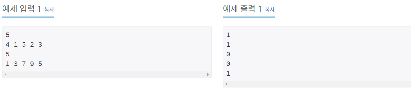 첫째 줄에 자연수 N(1≤N≤100,000)이 주어진다. 다음 줄에는 N개의 정수 A[1], A[2], …, A[N]이 주어진다. 다음 줄에는 M(1≤M≤100,000)이 주어진다. 다음 줄에는 M개의 수들이 주어지는데, 이 수들이 A안에 존재하는지 알아내면 된다. 모든 정수들의 범위는 int 로 한다.