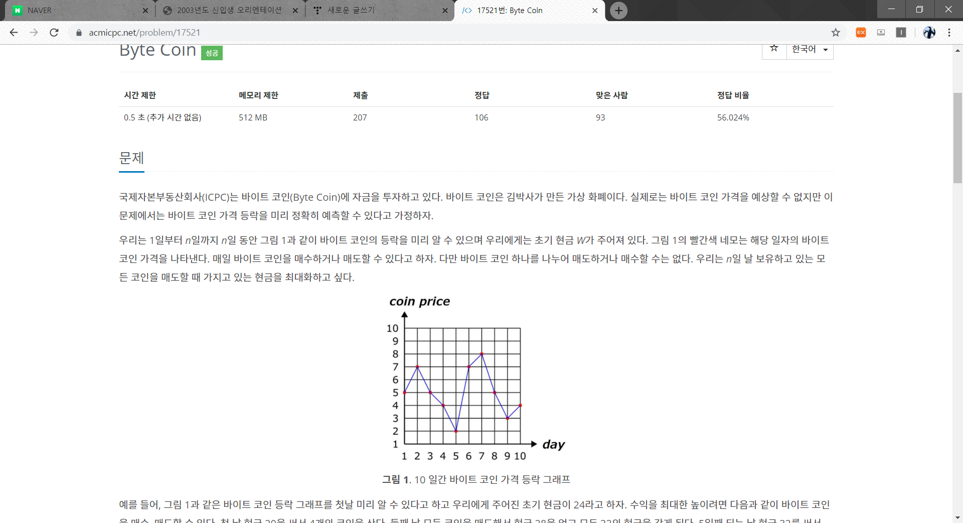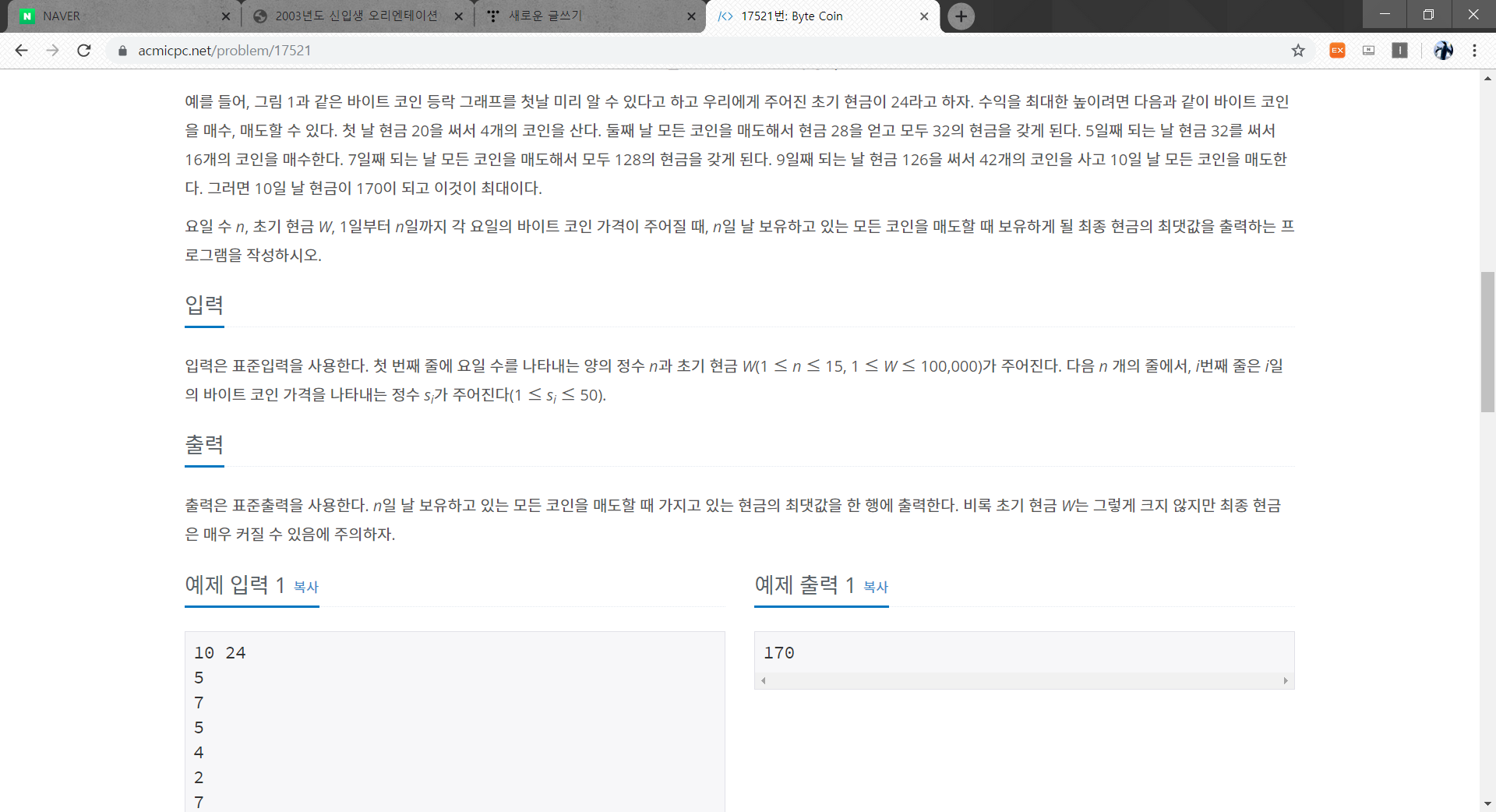 문제 국제자본부동산회사(ICPC)는 바이트 코인(Byte Coin)에 자금을 투자하고 있다. 바이트 코인은 김박사가 만든 가상 화폐이다. 실제로는 바이트 코인 가격을 예상할 수 없지만 이 문제에서는 바이트 코인 가격 등락을 미리 정확히 예측할 수 있다고 가정하자. 우리는 1일부터 n일까지 n일 동안 그림 1과 같이 바이트 코인의 등락을 미리 알 수 있으며 우리에게는 초기 현금 W가 주어져 있다. 그림 1의 빨간색 네모는 해당 일자의 바이트 코인 가격을 나