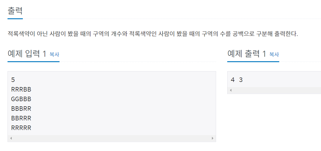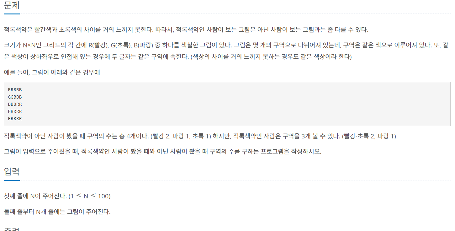 문제 적록색약은 빨간색과 초록색의 차이를 거의 느끼지 못한다. 따라서, 적록색약인 사람이 보는 그림은 아닌 사람이 보는 그림과는 좀 다를 수 있다. 크기가 N×N인 그리드의 각 칸에 R(빨강), G(초록), B(파랑) 중 하나를 색칠한 그림이 있다. 그림은 몇 개의 구역으로 나뉘어져 있는데, 구역은 같은 색으로 이루어져 있다. 또, 같은 색상이 상하좌우로 인접해 있는 경우에 두 글자는 같은 구역에 속한다. (색상의 차이를 거의 느끼지 못하는 경우도 같은