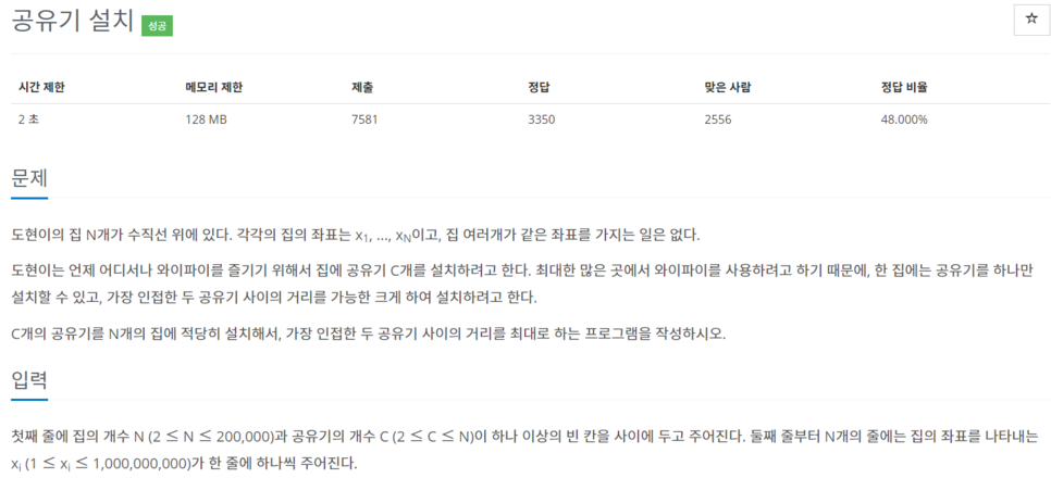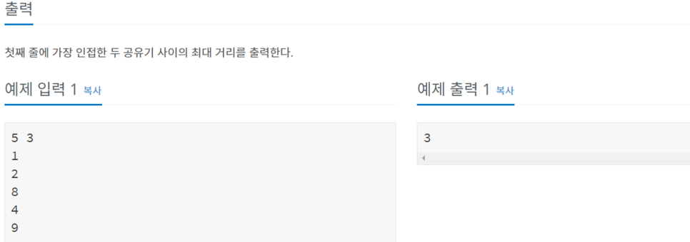첫째 줄에 집의 개수 N (2 ≤ N ≤ 200,000)과 공유기의 개수 C (2 ≤ C ≤ N)이 하나 이상의 빈 칸을 사이에 두고 주어진다. 둘째 줄부터 N개의 줄에는 집의 좌표를 나타내는 xi (0 ≤ xi ≤ 1,000,000,000)가